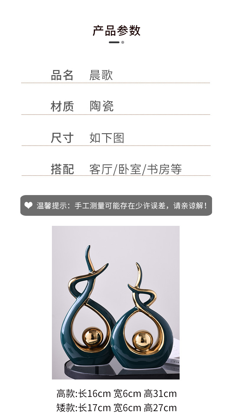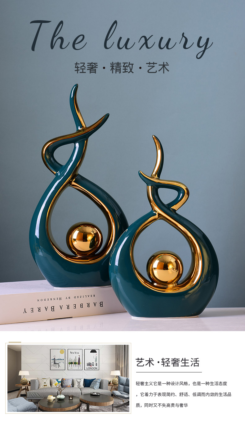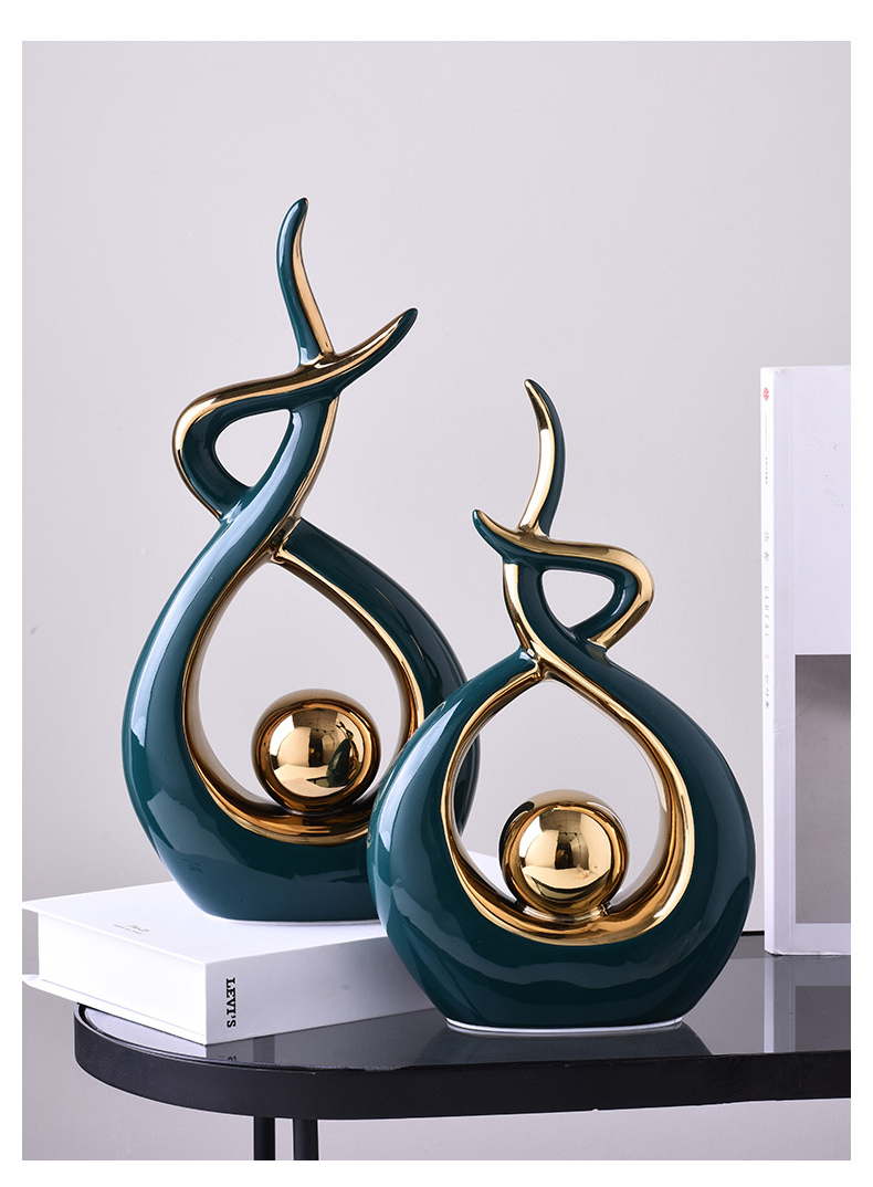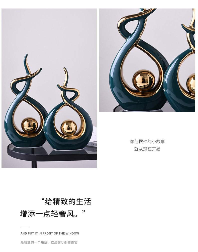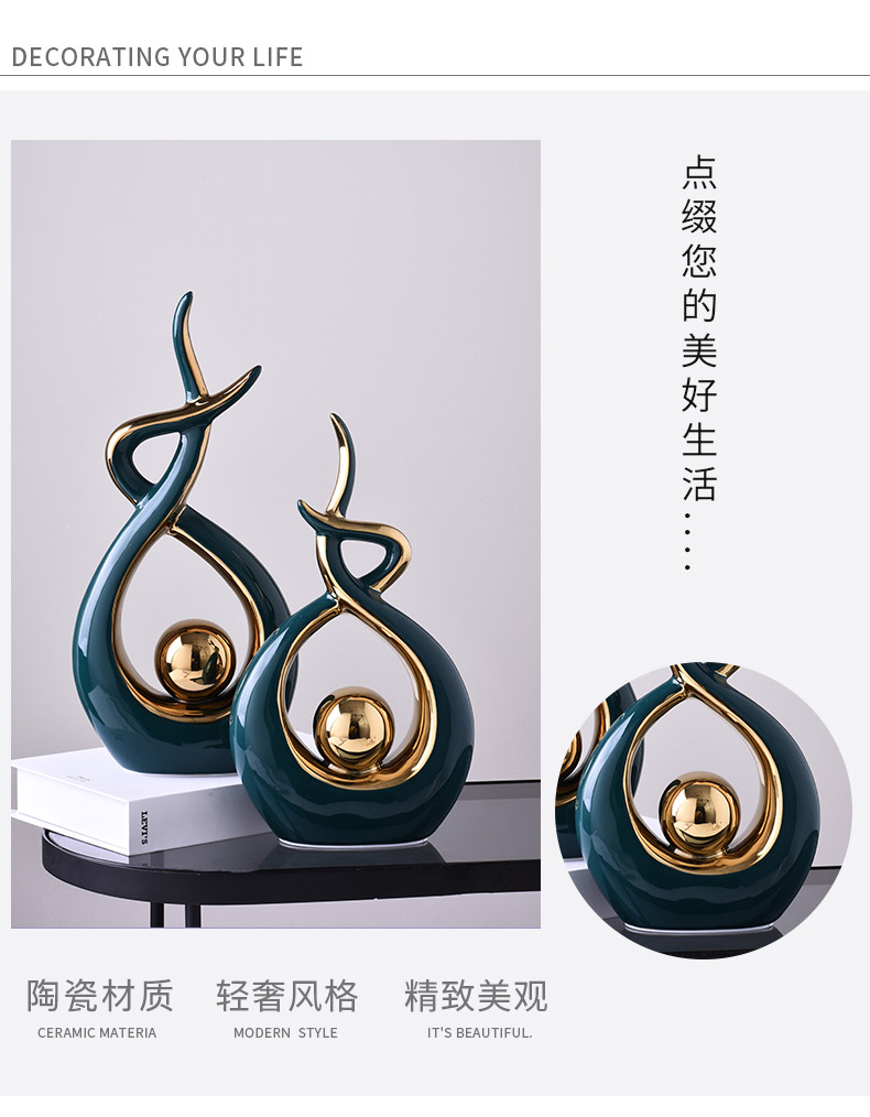 Crafted from premium ceramics, the Modern Minimalist Living Room TV Cabinet Wine Cabinet Decoration Green Gold Bottle Home Ceramic Decorations Accessible Luxury Soft Outfit Crafts exudes a luxurious and elegant feel. Available in high and low models, measuring approximately 9.9*4.6*2.3 inches and 8.7*5.1*2.4 inches respectively, this Abstract Art Modern statue decoration is expertly made with high temperature firing resulting in a smooth surface and comfortable touch. The piece is also easy to clean, odorless, non-toxic, and harmless. With its unique design, the statue's two corners symbolize an inseparable pair of lovers. The bottom is equipped with a non-slip cushion to keep it in place and protect furniture from scratches. Adorned with texture and simplicity, this contemporary ceramic decoration is sure to catch the eye with its reflective, vibrant colors in good light.
